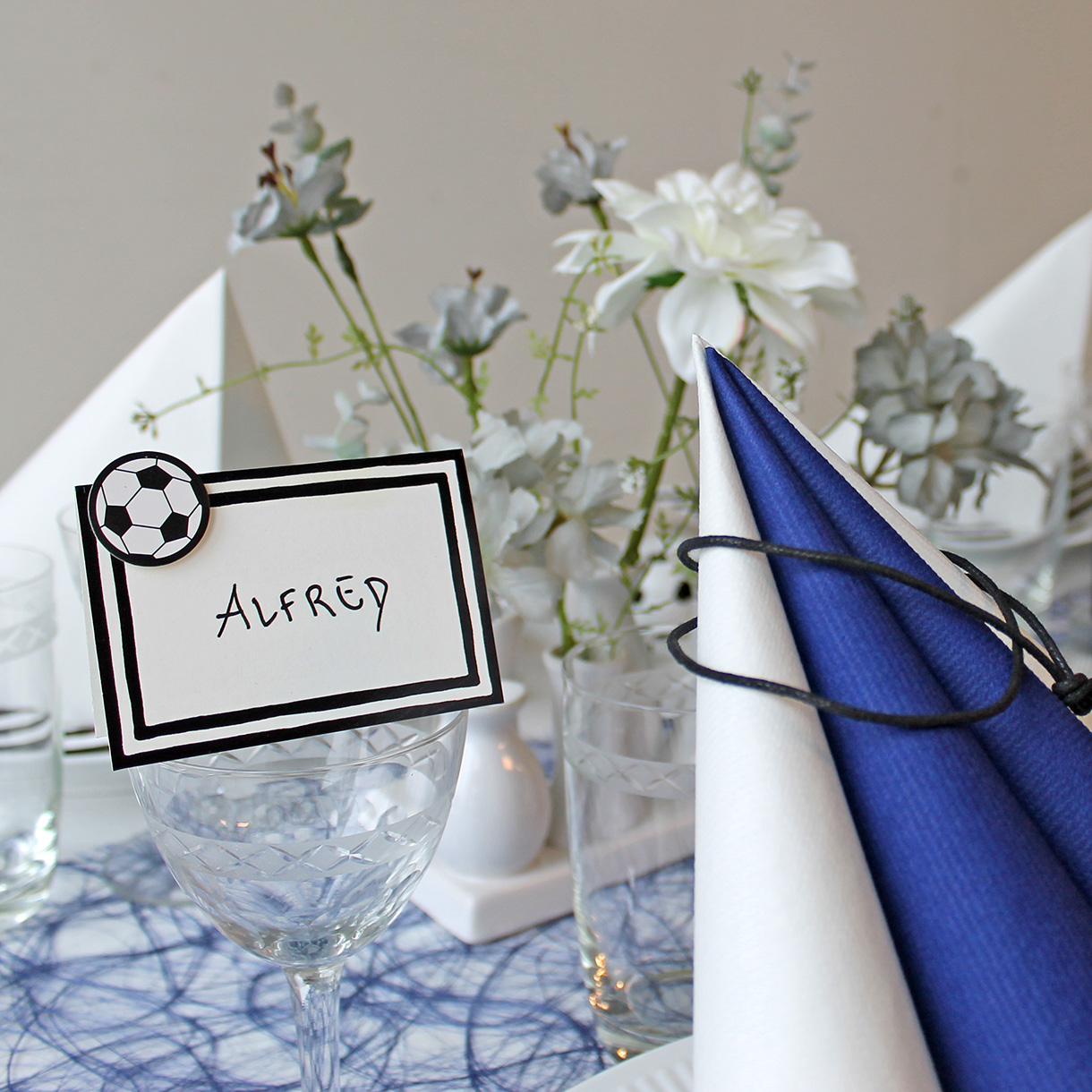 Du kan bruge bordkortet, som det er, men der er også god plads til at dekorere det i hjørnet med en lille sticker, fx. en fodbold, som jeg har gjort på billedet ved siden af. Gæstens navn kan du skrive med en sort posca tusch.