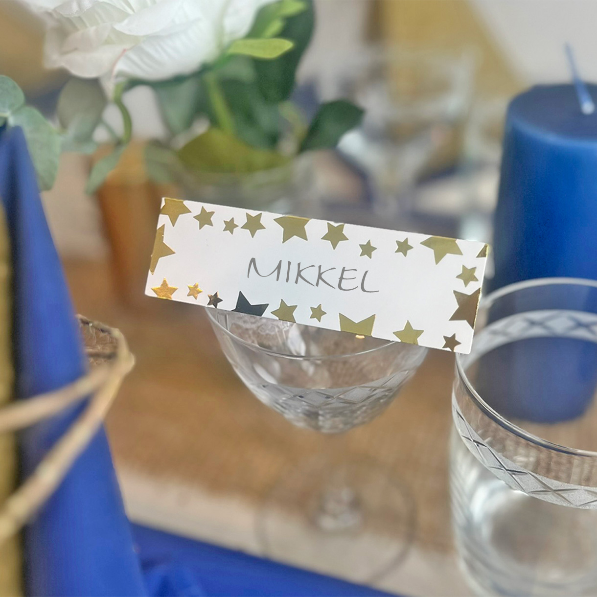 Bordkort eller glaskort, alt efter hvor du stiller det, med så fine folierede guldstjerner langs kanten. Stjernerne skinner så fint, mere end du lige kan se på billedet her. Det er perfekt til konfirmation, fødselsdag, jul, nytår og guldbryllup!