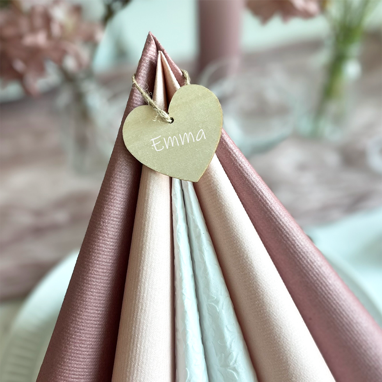 Du kan skrive navn på hjertet med en posca tusch i en farve, der matcher din borddækning.