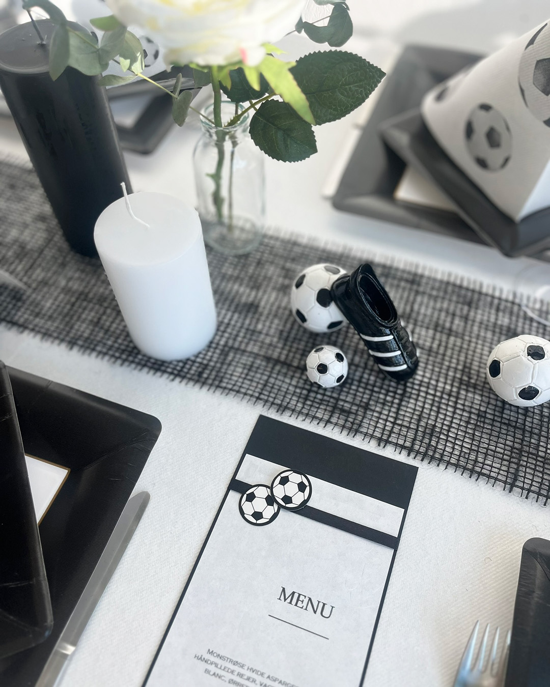 Jeg plejer at lægge dem sammen med et par stykker af fodbolden i mellemstørrelse samt 1-2 fodboldstøvler. Du kan se det på billederne her ved siden af, men jeg har også lavet flere forskellige borddækninger i fodboldtema, du kan se lige her