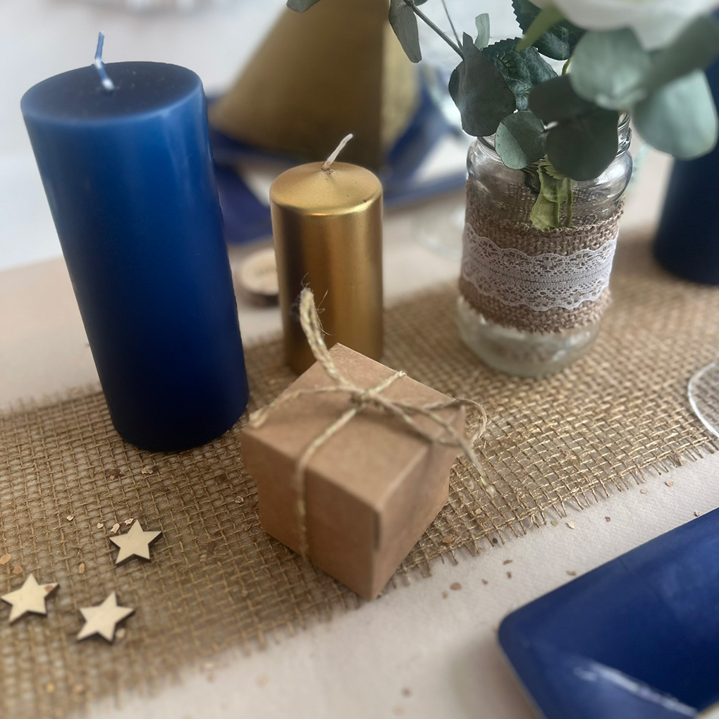 Du kan se en borddækning i blå og guld tema, jeg har dækket her, hvor jeg har brugt æsken.