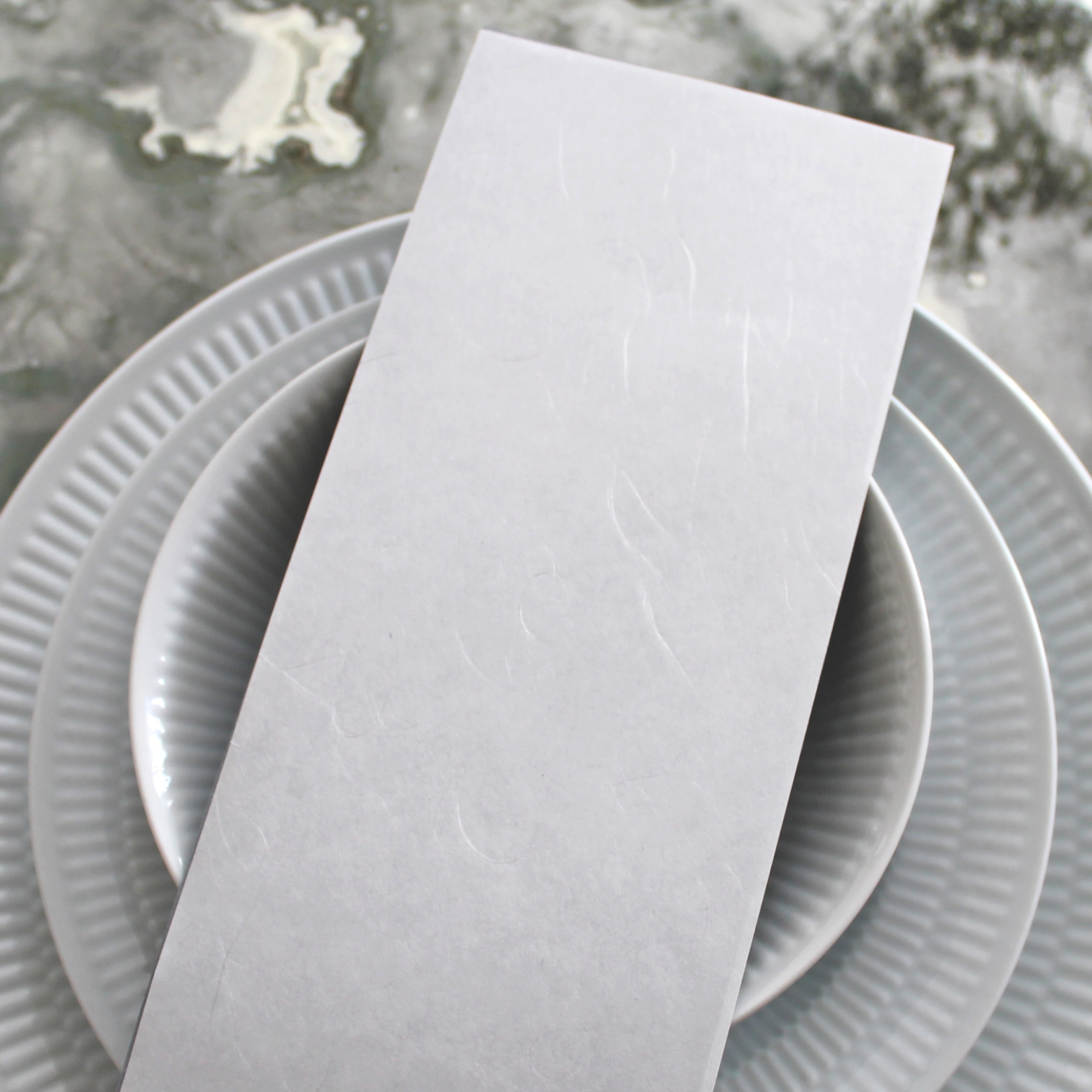 Smukt håndlavet indisk A4 papir med fine indvævede silketråde. Papiret er blank, næsten perlemorskinnende i overfladen, der gør det meget elegant. Du kan printe på papiret, så brug det når du skal lave menukort eller invitationer. Det har jeg gjort på billedet med det sorte menukort.