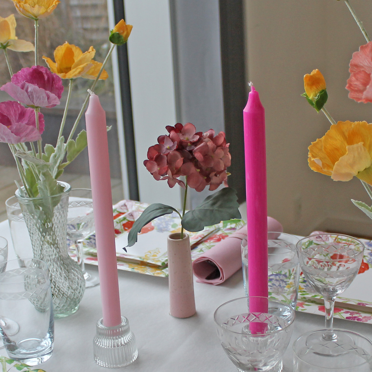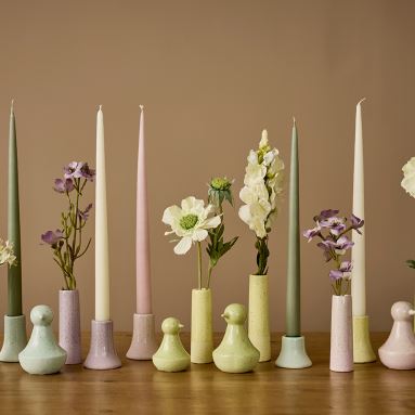 De fineste smalle små keramikvaser, perfekt størrelse til at stå på et festbord. Vaserne er egnet til simple blomsteranretninger, en enkelt blomst eller 2 i hver vase, det ser rigtig flot ud, og vaserne bliver på den måde også en del af dekorationen.