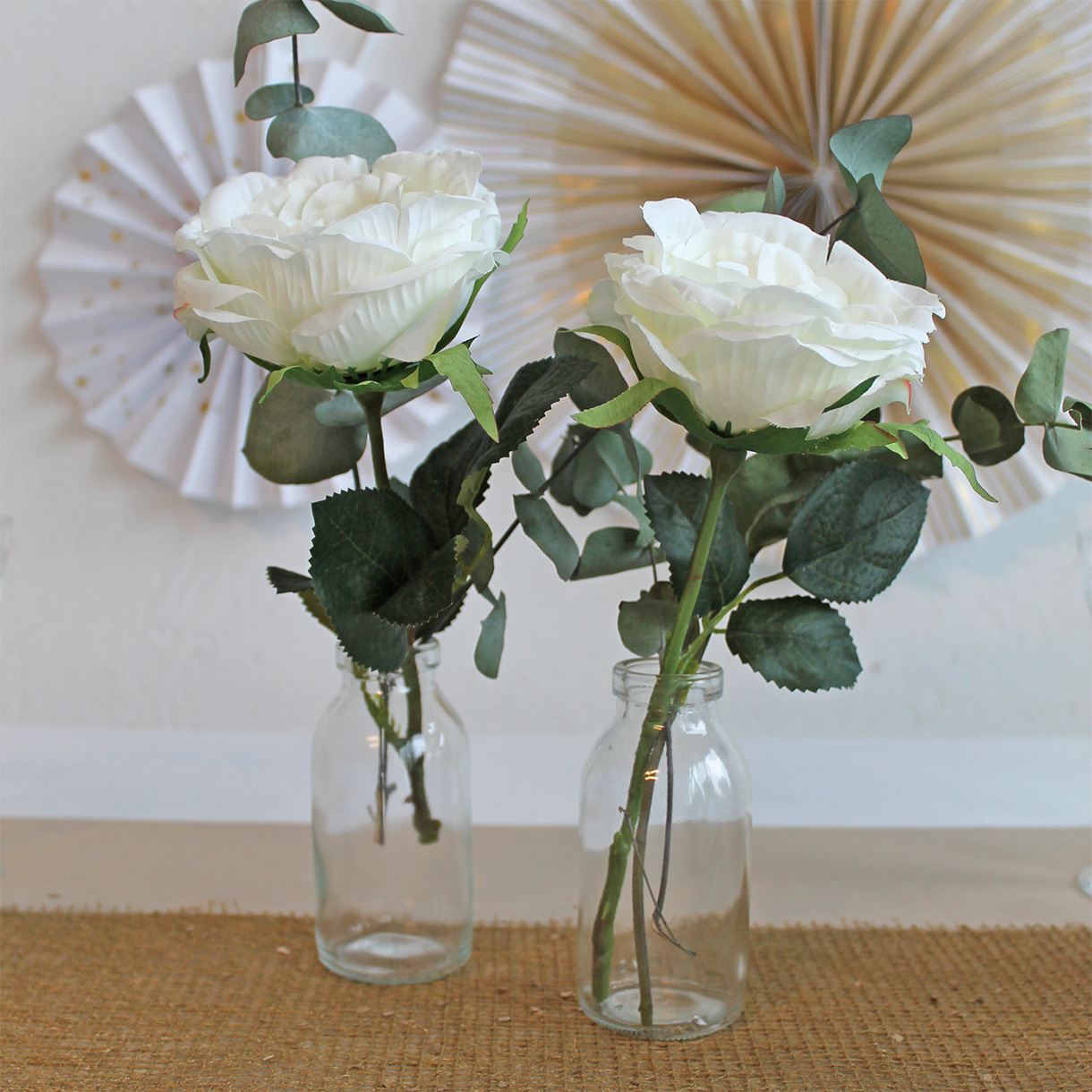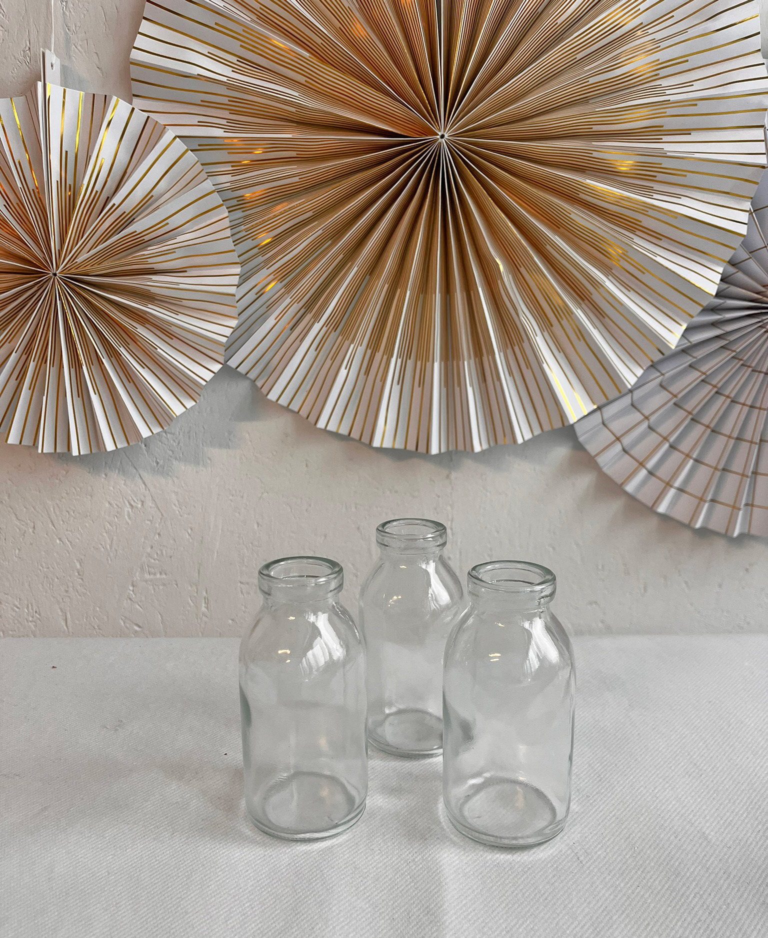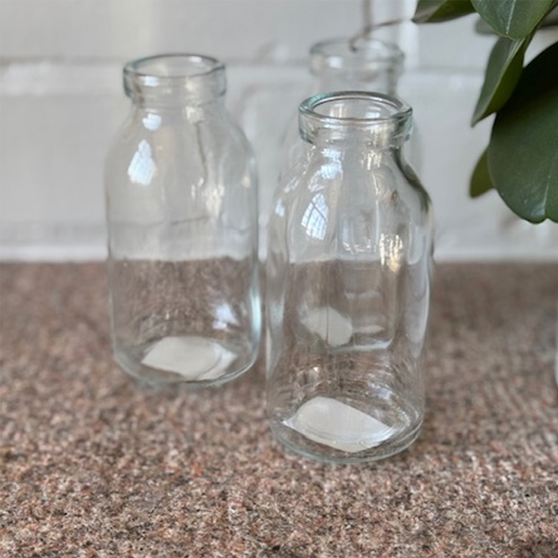 Små fine minivaser/flasker med god plads til stilke af blomster eller eukalyptusgrene. De har en størrelse der egner sig både til at stille i en gruppe sammen med bloklys eller lidt 'forskudt' enkeltvis hen ad bordet.