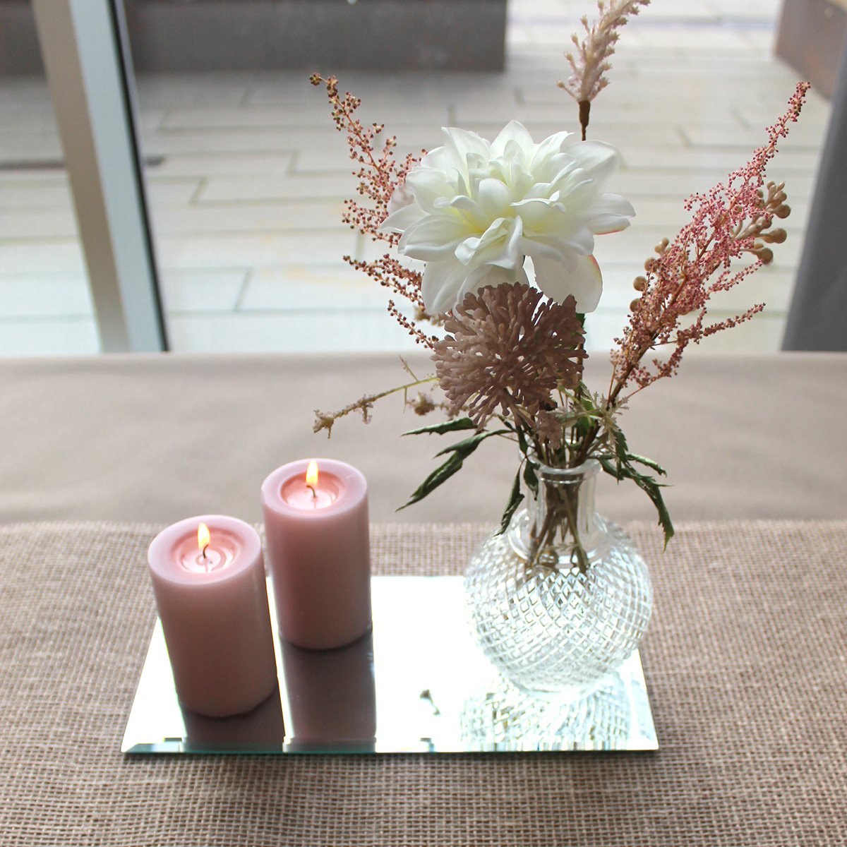 Et godt fad til at stille en gruppe lys på, evt. sammen med en enkelt vase og lidt sten, skaller, drys..