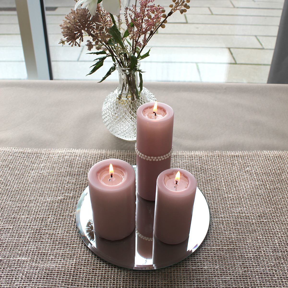 Et godt fad til at stille en gruppe lys på, evt. sammen med en enkelt vase og lidt sten, skaller, drys..