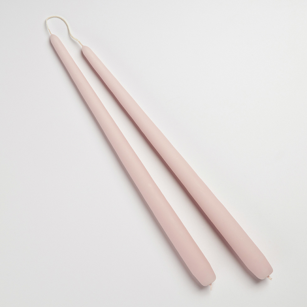 Overdyppede stagelys fra Diederich Lys i en fin, næsten babylyserød farve. Vægerne bliver monteret på et stativ og hånddyppes 2 gange i den varme voks, indtil de har opnået den rigtige størrelse.