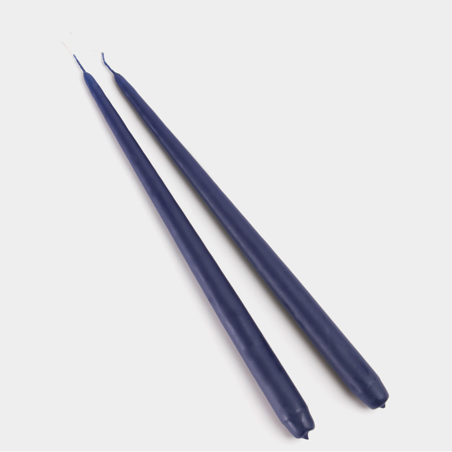Mørkeblå overdyppede stagelys fra Diederich Lys. Vægerne bliver monteret på et stativ og hånddyppes 2 gange i den varme voks, indtil de har opnået den rigtige størrelse.