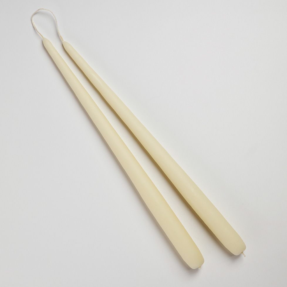 Cremefarvede overdyppede stagelys fra Diederich Lys. Vægerne bliver monteret på et stativ og hånddyppes 2 gange i den varme voks, indtil de har opnået den rigtige størrelse.