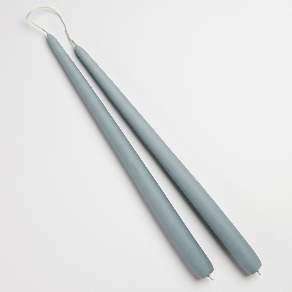 Overdyppede stagelys fra Diederich Lys i en superflot støvblå farve. Vægerne bliver monteret på et stativ og hånddyppes 2 gange i den varme voks, indtil de har opnået den rigtige størrelse.
