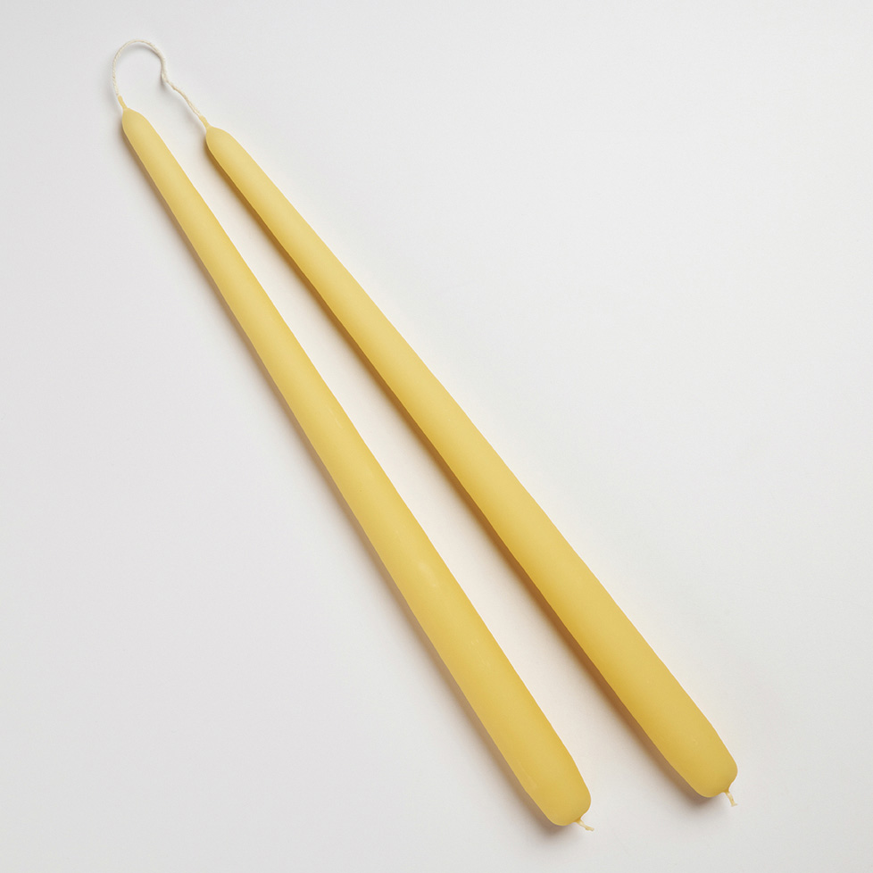 Overdyppede stagelys fra Diederich Lys i en sart gul, rigtig flot at mikse med andre pastelfarver. Vægerne bliver monteret på et stativ og hånddyppes 2 gange i den varme voks, indtil de har opnået den rigtige størrelse.