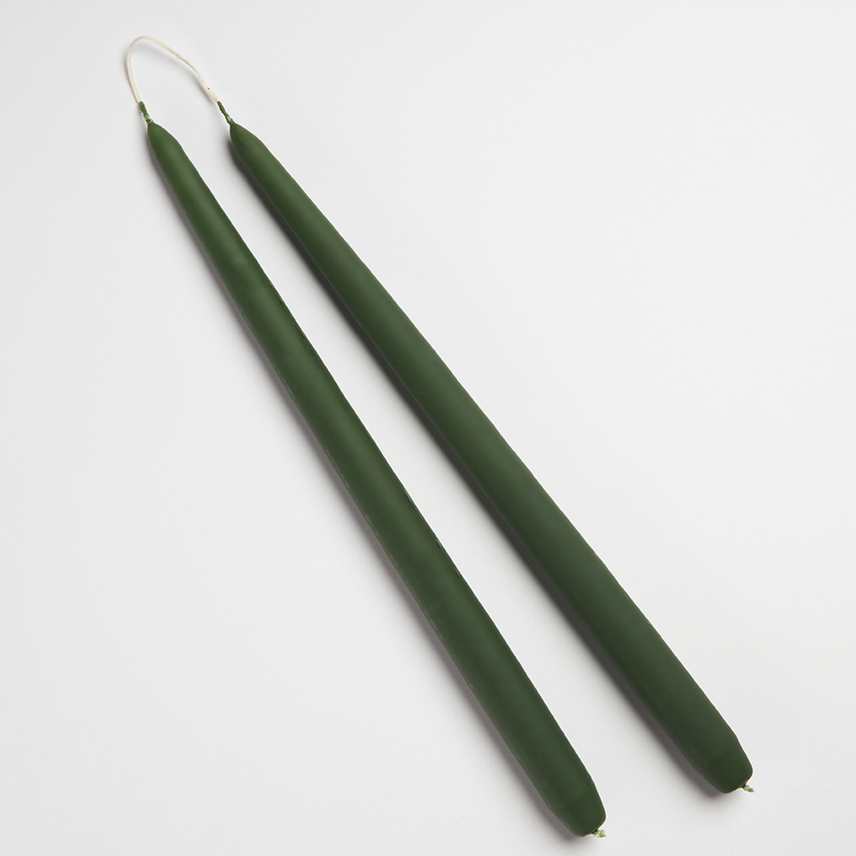 Overdyppede stagelys fra Diederich Lys i en rigtig flot mørkegrøn farve. Vægerne bliver monteret på et stativ og hånddyppes 2 gange i den varme voks, indtil de har opnået den rigtige størrelse.