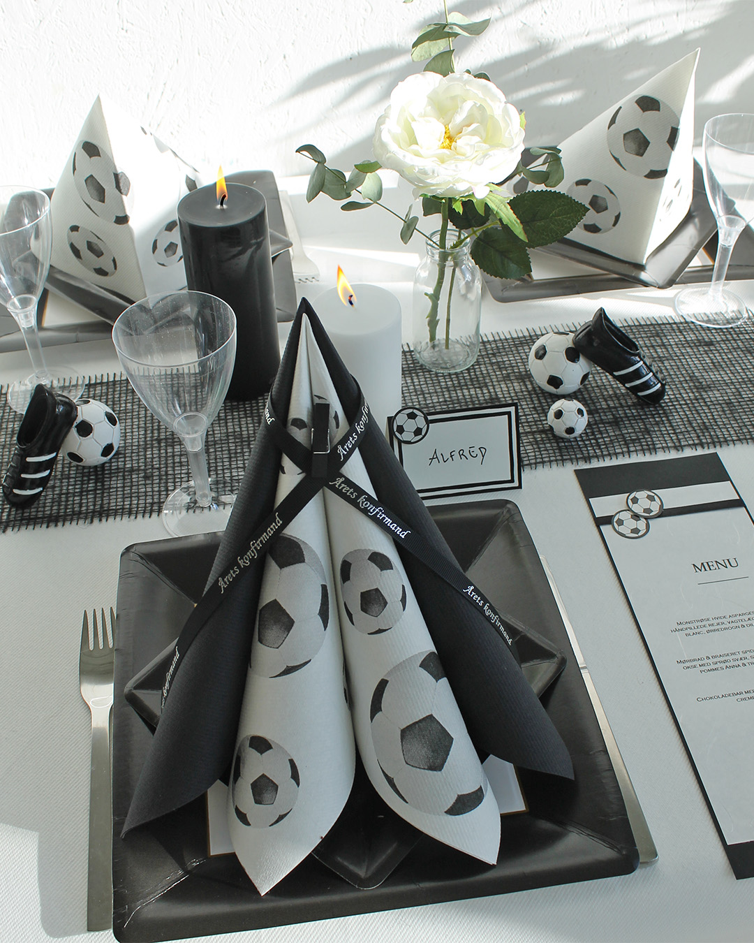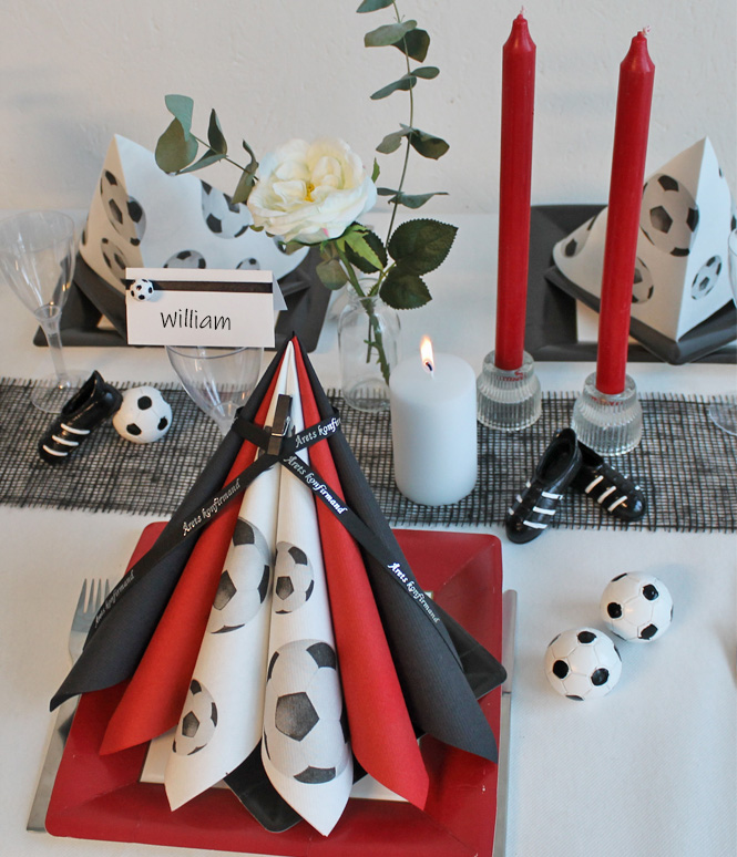 Dekorativ airlaid serviet med fodboldtryk af ekstra høj kvalitet. Perfekt til den fodboldinteresserede konfirmand! Du kan mixe den med en ensfarvet serviet i favoritklubbens farver for at fremhæve farvetemaet. Du kan se mine inspirationsborde i fodboldtema her.