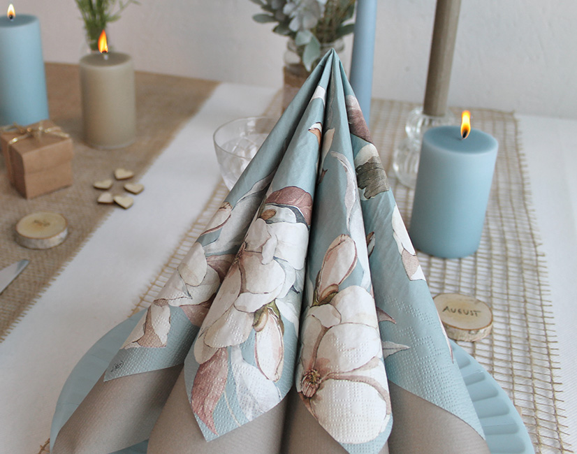 Den smukkeste blomst (som jeg synes er en udsprunget magnolia) i de fineste sarte toner! Der er så mange farvenuancer i det malede motiv, at du kan sætte den sammen med rigtig mange ensfarvede servietter. Fx powder, gammelrosa, lilla og som jeg har gjort på borddækningen, en sandfarvet.