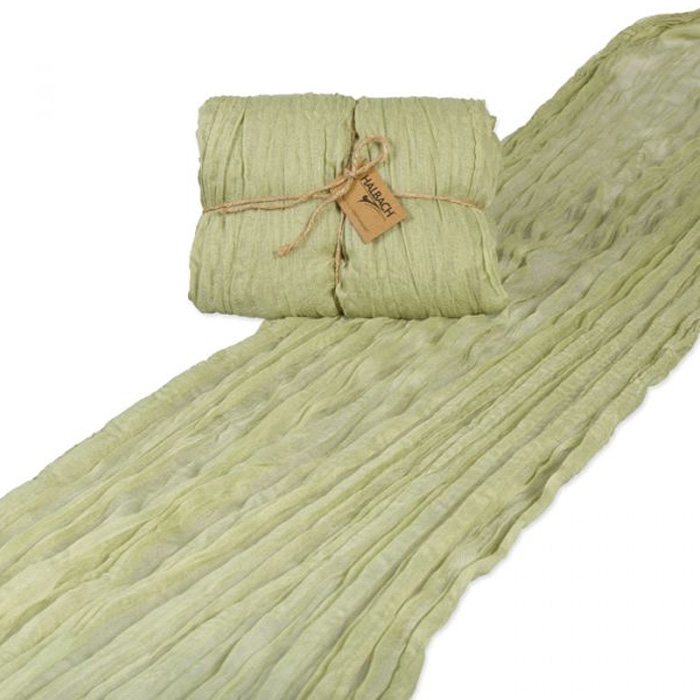 Superblød, semi transparent bordløber, der føles som og ligner bomuld. Materialet er 100% polyester og kan vaskes ved 30 grader, så den kan bruges igen og igen, eller sælges videre efter brug,