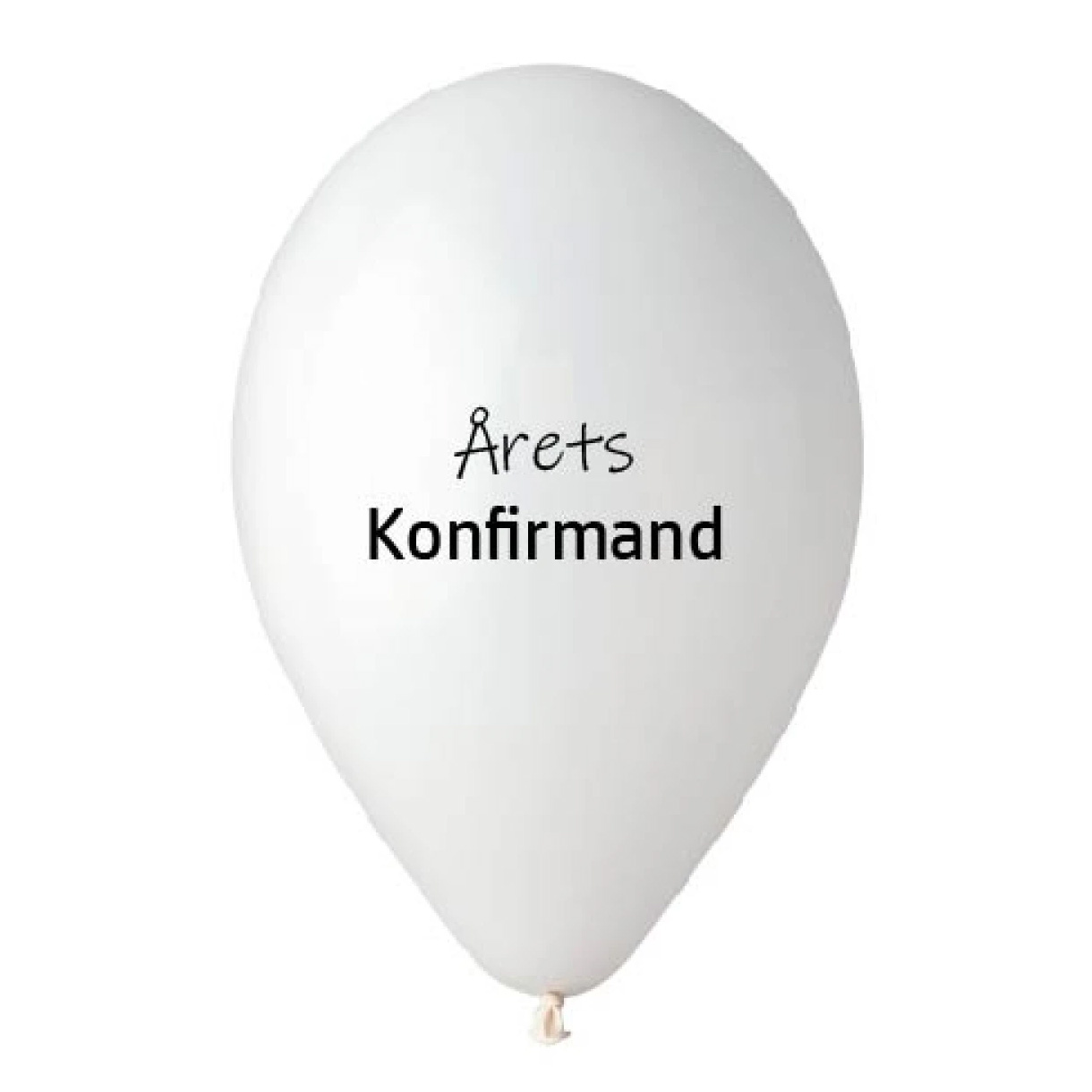 'Årets konfirmand' er trykt på begge sider af ballonen. De opblæste balloner er ca. 28-30 cm i diameter på tværs af det bredeste sted.