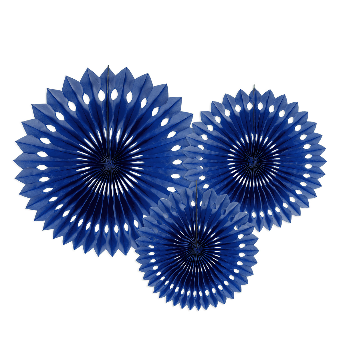 Sættet indeholder mørkeblå papirrosetter i tre størrelser (ca. 20, 25 og 30 cm i diameter), som giver en flot variation og dybde.