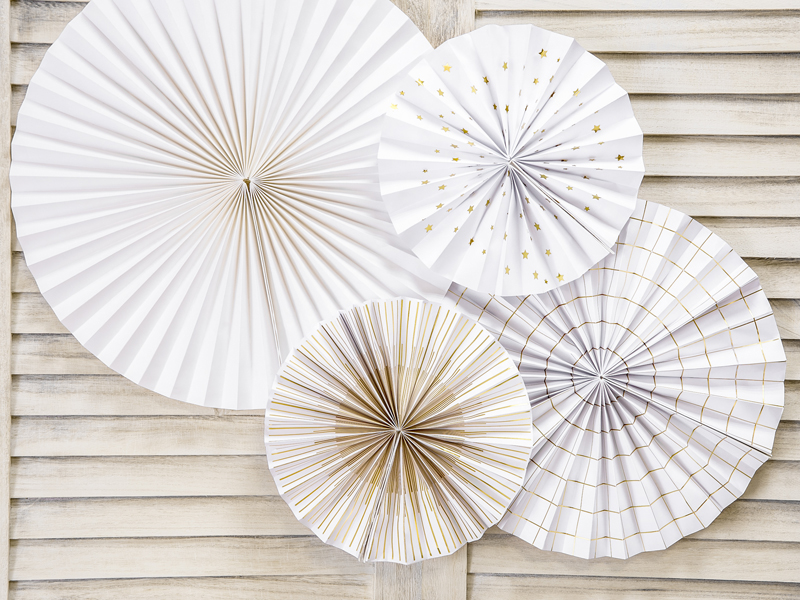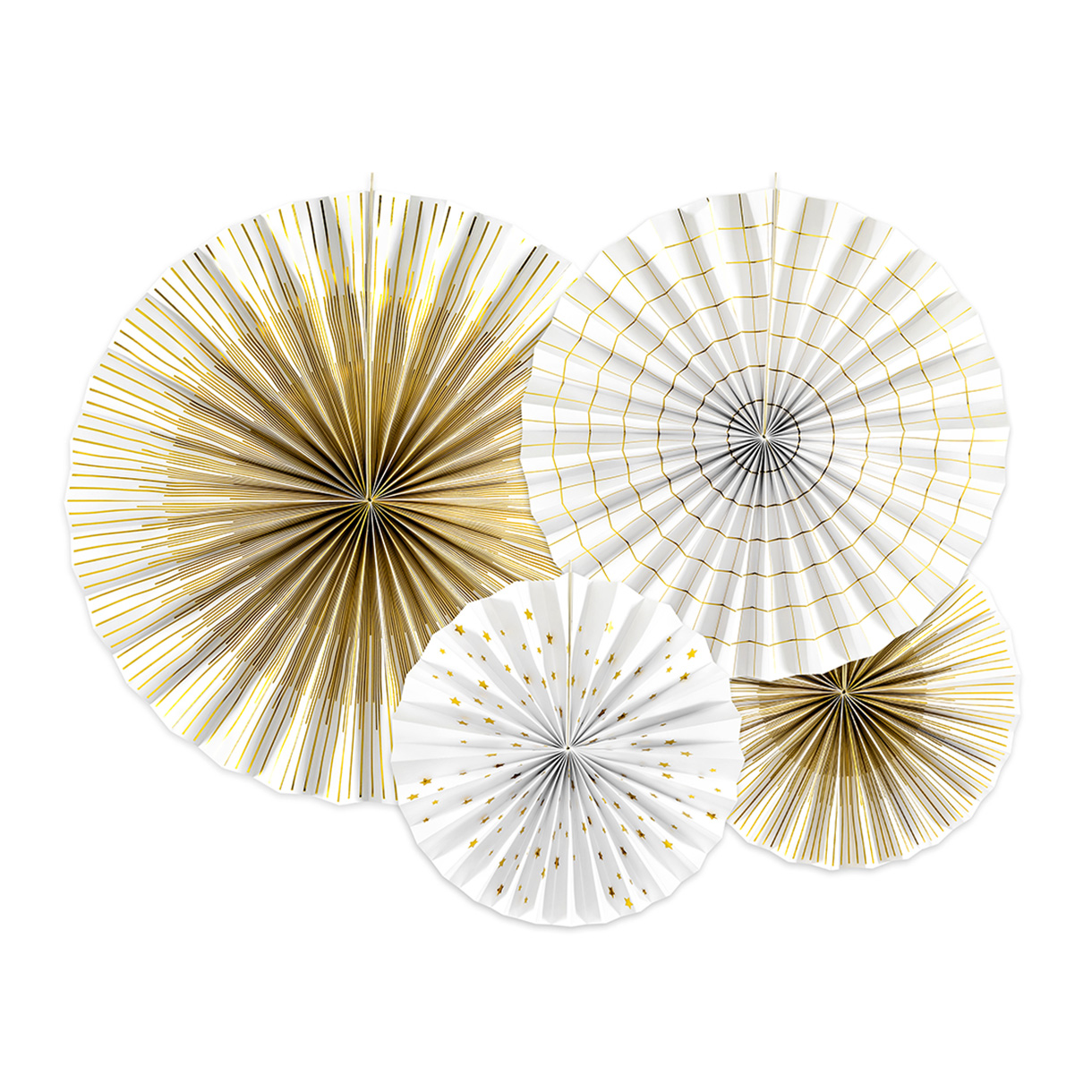 Sættet indeholder 4 dekorative rosetter af pap i tre størrelser (23, 32 og 40 cm i diameter). Mønstret på rosetterne er lavet i guld og hvid og gør dem meget egnede at mikse med stort set alle farver - men naturligvis er det også flot at holde temaet i rent hvid og guld.