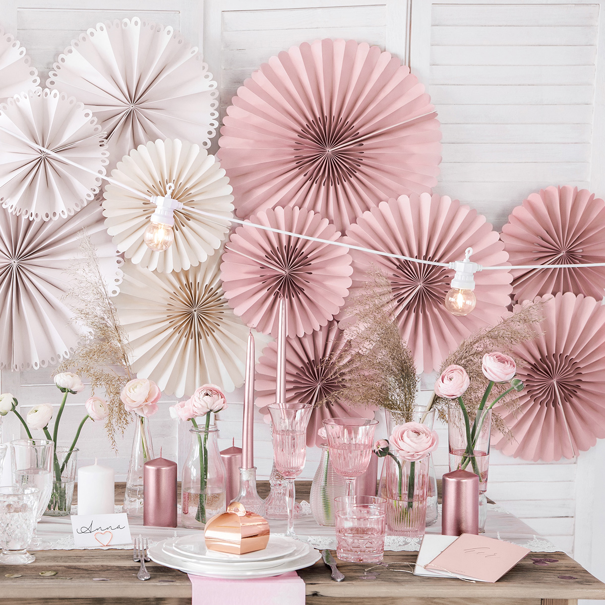 Du kan bruge dem som dekoration mange steder i festlokalet fx over gavebordet, over bordene, på væggene eller sammen med balloner og guirlander måske som velkomstport til festen. Det er også flot at mikse rosetterne med de hvide, lyserøde og guldmønstrede jeg har.