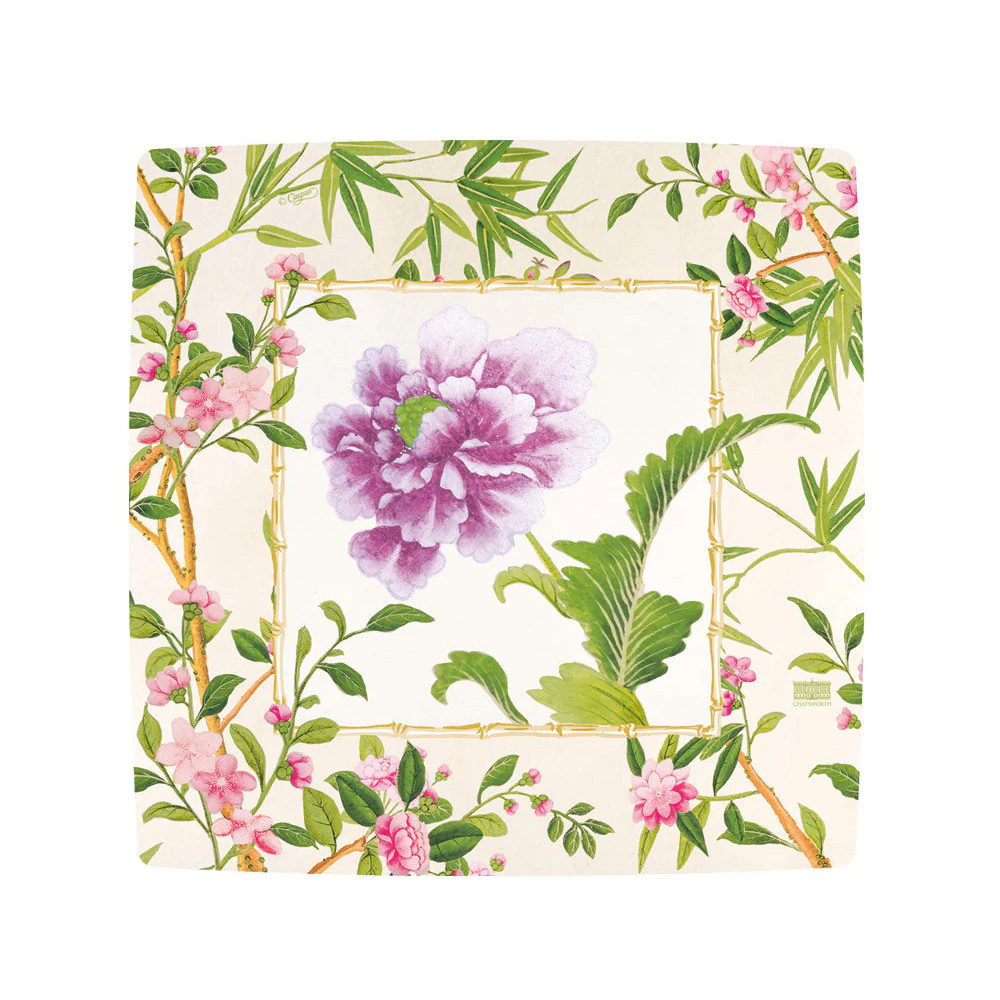 Paptallerkner fra Caspari tegnet med inspiration fra Chatsworth House i Devonshire og deres ikoniske kinesiske håndmalede tapeter. Det er da heller ikke svært at se kinesiske referencer i motivet.