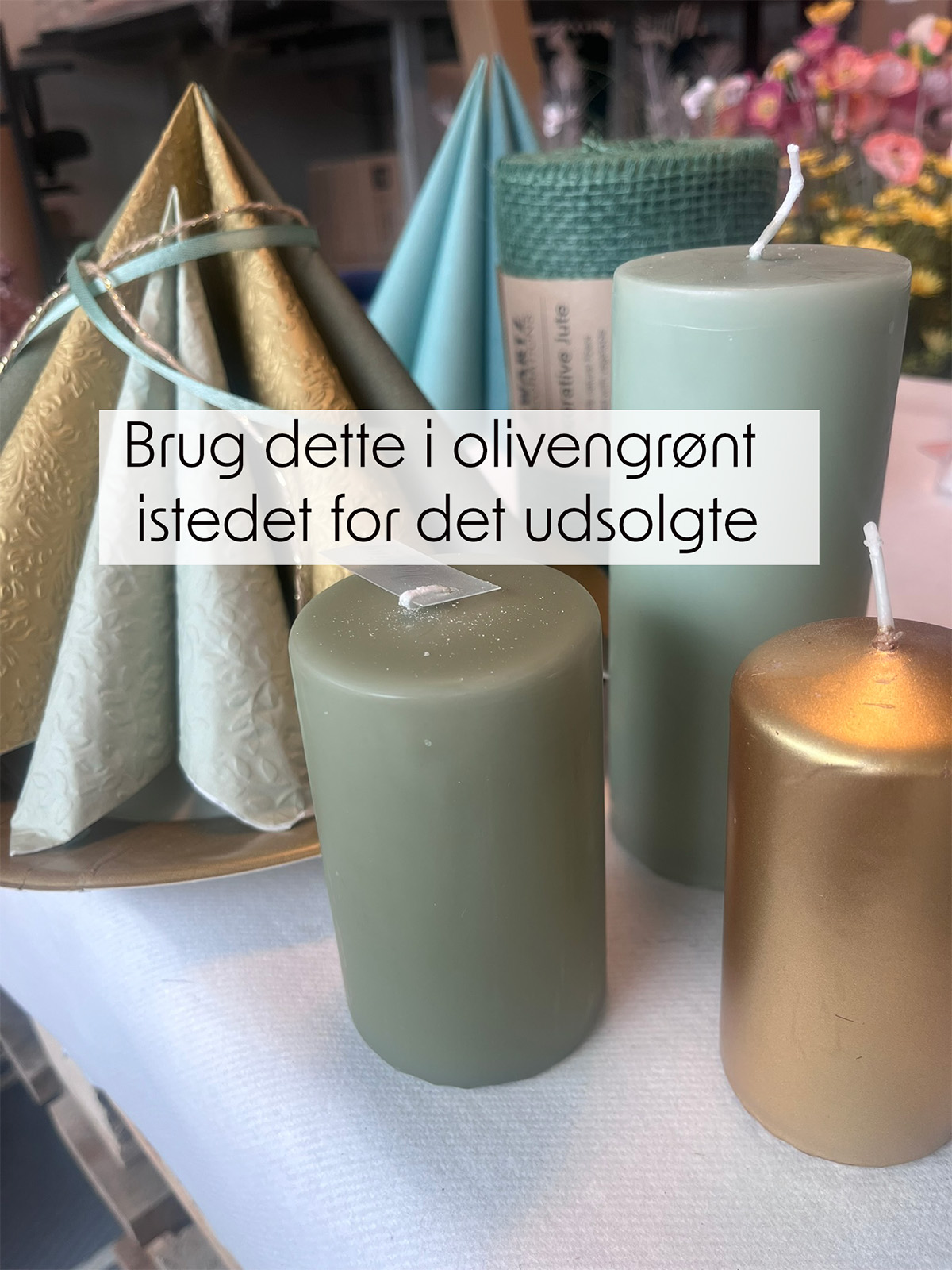 BEMÆRK: LYSET ER UDSOLGT, MEN JEG HAR ISTEDET FÅET ET MEGET FLOT STØVET OLIVENGRØNT LYS HJEM, DER PASSER TIL DEN BORDDÆKNING, JEG VISER PÅ SHOPPEN. JEG HAR LAGT ET LILLE BILLEDE IND HER, HVOR DU KAN SE DET MED DE ANDRE LYS.