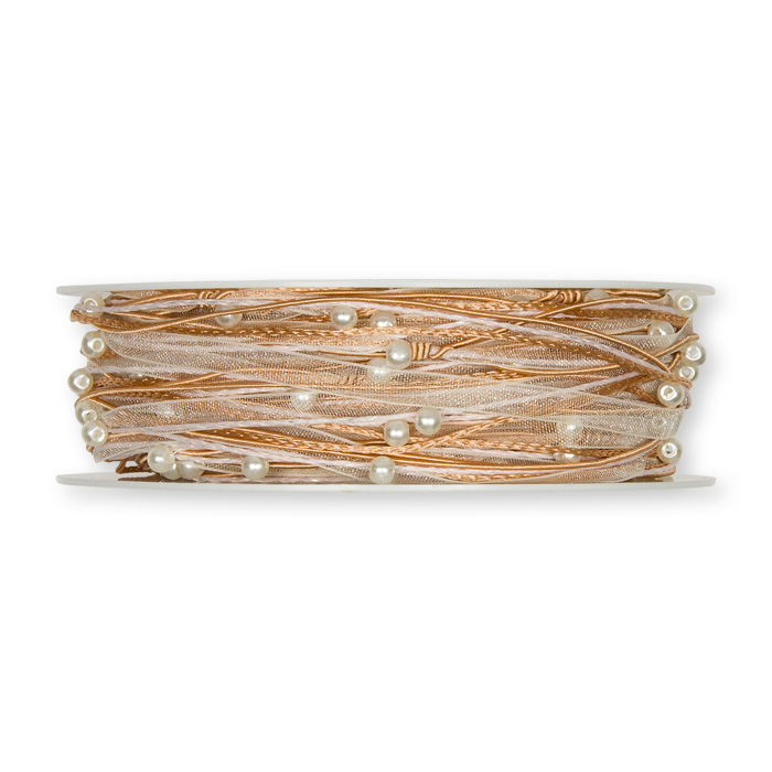 Meget smukt og dekorativt bånd, særligt egnet til kobberbryllup og konfirmation. Det består af hvid organzabånd samt powder og kobberfarvet snor og dertil perler med jævne mellemrum. Der er wire i, så du nemt kan forme båndet, som du ønsker, fx. rundt om servietter.