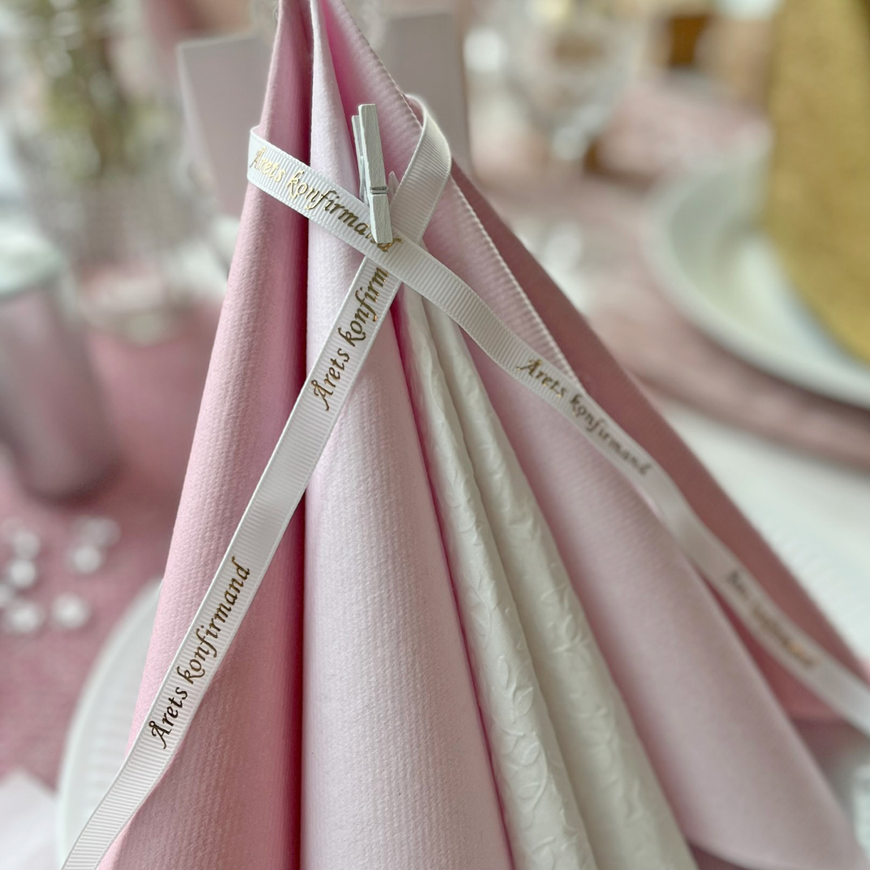 Smukt hvidt rillet satinbånd med 'årets konfirmand' trykt med guld. Som du kan se på billedet, bruger jeg ofte båndet som servietpynt.