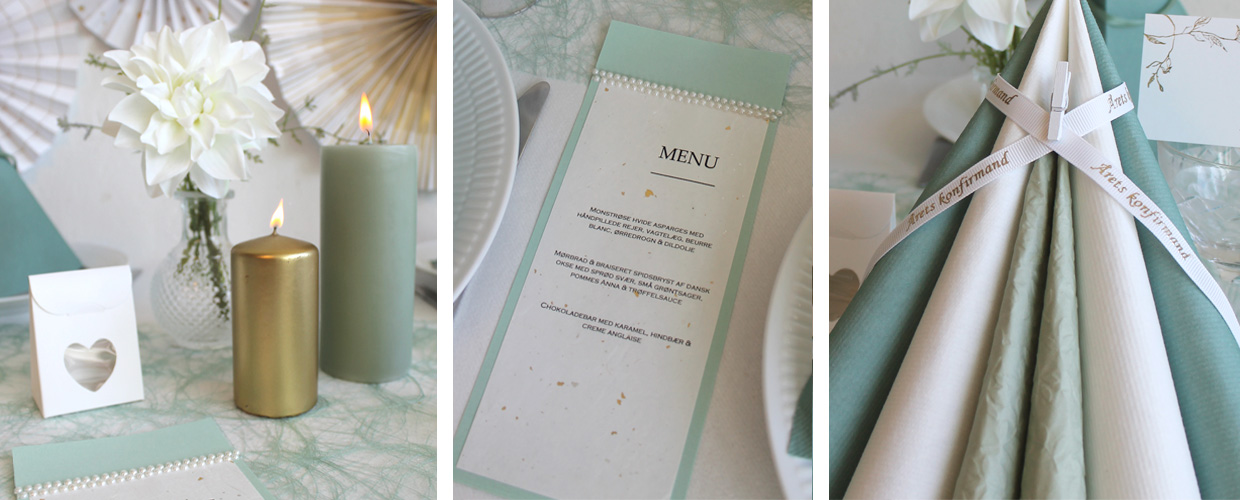 Jeg har brugt 2 forskellige slags bånd rundt om servietterne, så der er et forslag både til konfirmation og andre fester. Længere nede på siden kan du se hvordan, du laver menukort, det er supernemt.